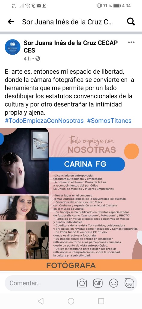 Licenciada en antropología y fotógrafa. Obtuvo los premios: Diosa de la Luz categoría Glamour por trayectoria y portafolio, primer lugar en el concurso del Salón de la Foto en el Museo de Arte Moderno Guadalajara; reconocimientos del periódico La Unión de Morelos y Mujeres Empresarias como fotógrafa y directora de portadas; tercer lugar en el concurso Temas en Imágenes de la revista Temas Antropológicos de la Universidad de Yucatán, ganadora en el concurso Haz Cllick con Crehana y exposición en el Mural Crehana en el museo Soumaya, seleccionada en el concurso Miradas Artísticas sobre la Pandemia UNAM y Gobierno de México, seleccionada y publicada en la revista “fotógrafas en el mundo”. Su trabajo se seleccionó en revistas especializadas de fotografía como Cuartoscuro®, Fotozoom® y PHOTO®. Participó en varias exposiciones colectivas e individuales Diplomada en Producción de Proyectos Artísticos de la Facultad de Artes UAEM. Fue profesora de fotografía de nivel medio y superior y tallerista de retrato fotográfico en universidades como el ITESM y UAEM. Presentó ponencias de antropología social en el INAH. Fue coeditora de la revista Consentidos. Colaboradora y articulista en revistas como Fotozoom y Somos Fotógrafas. Su labor actual como artista se enfoca en establecer reflexiones en torno a las relaciones y percepciones humanas desde un punto de vista antropológico. Su trabajo también la ha llevado a considerarse activista de la autoestima, trabajando en un grupo de solo mujeres a través de redes haciendo campañas, reflexiones y exposiciones sobre el cuerpo, la autopercepción y la autoestima.